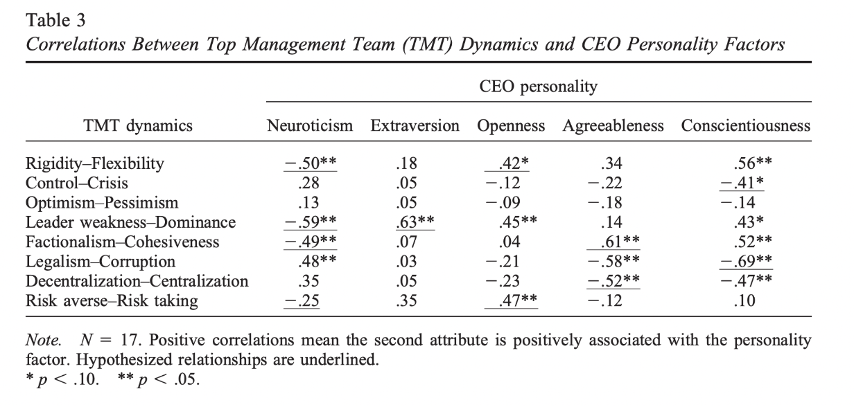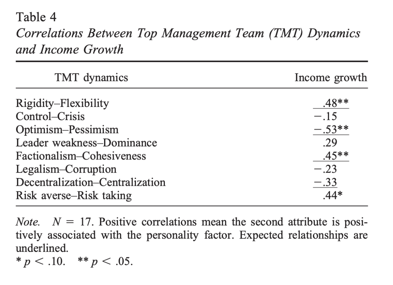 Flexibility in tabel 4 heeft een sterk verband met groei van inkomsten (.48), en Conscientiousness bij de CEO (zeg maar sociale compliancy, hard werken, discipline, betrouwbaarheid) in tabel 3 heeft een sterk verband met Flexibility.